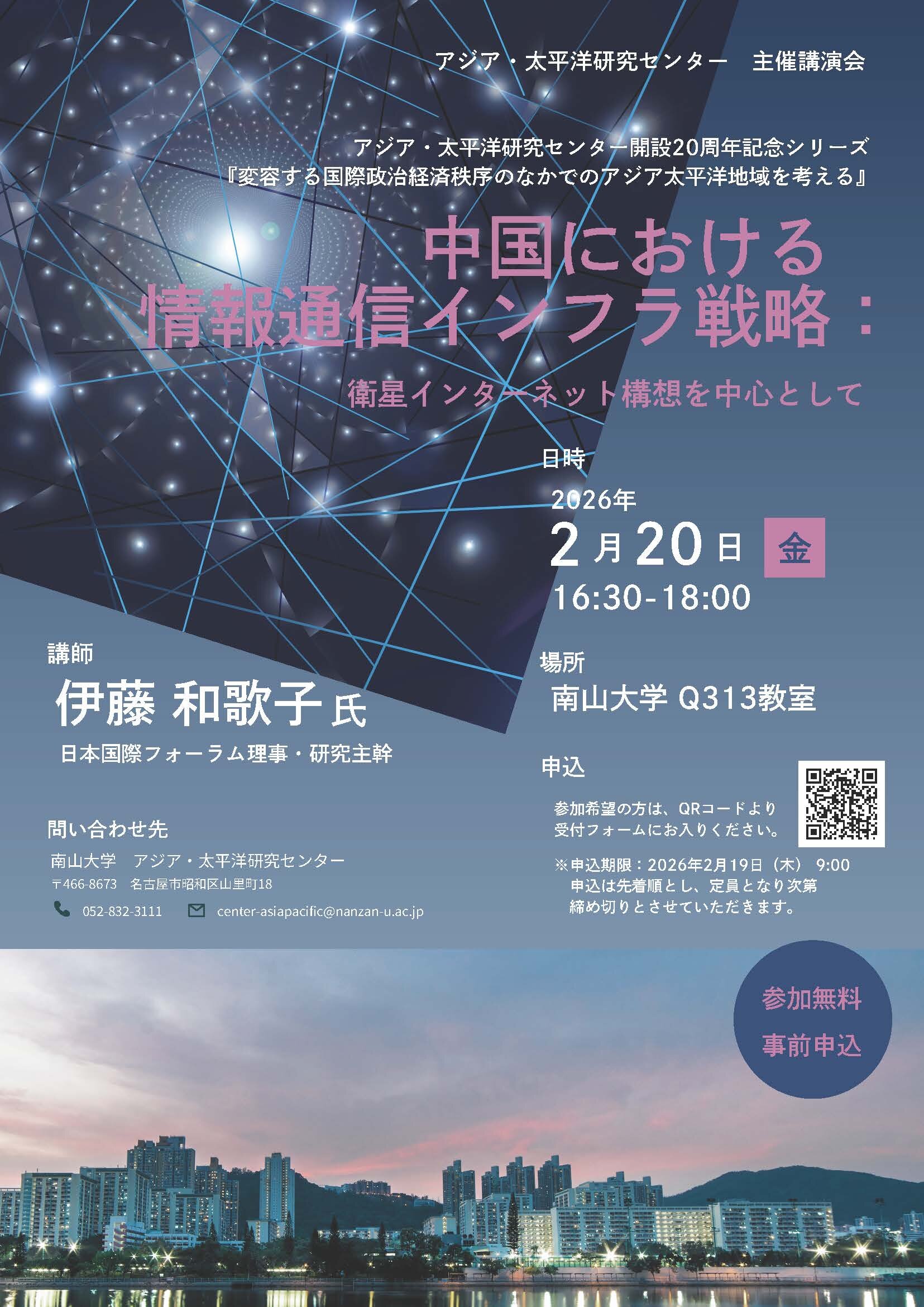 2026年2月20日(金)主催シリーズ講演会 「中国における情報通信インフラ戦略:衛星インターネット構想を中心として」 を開催します